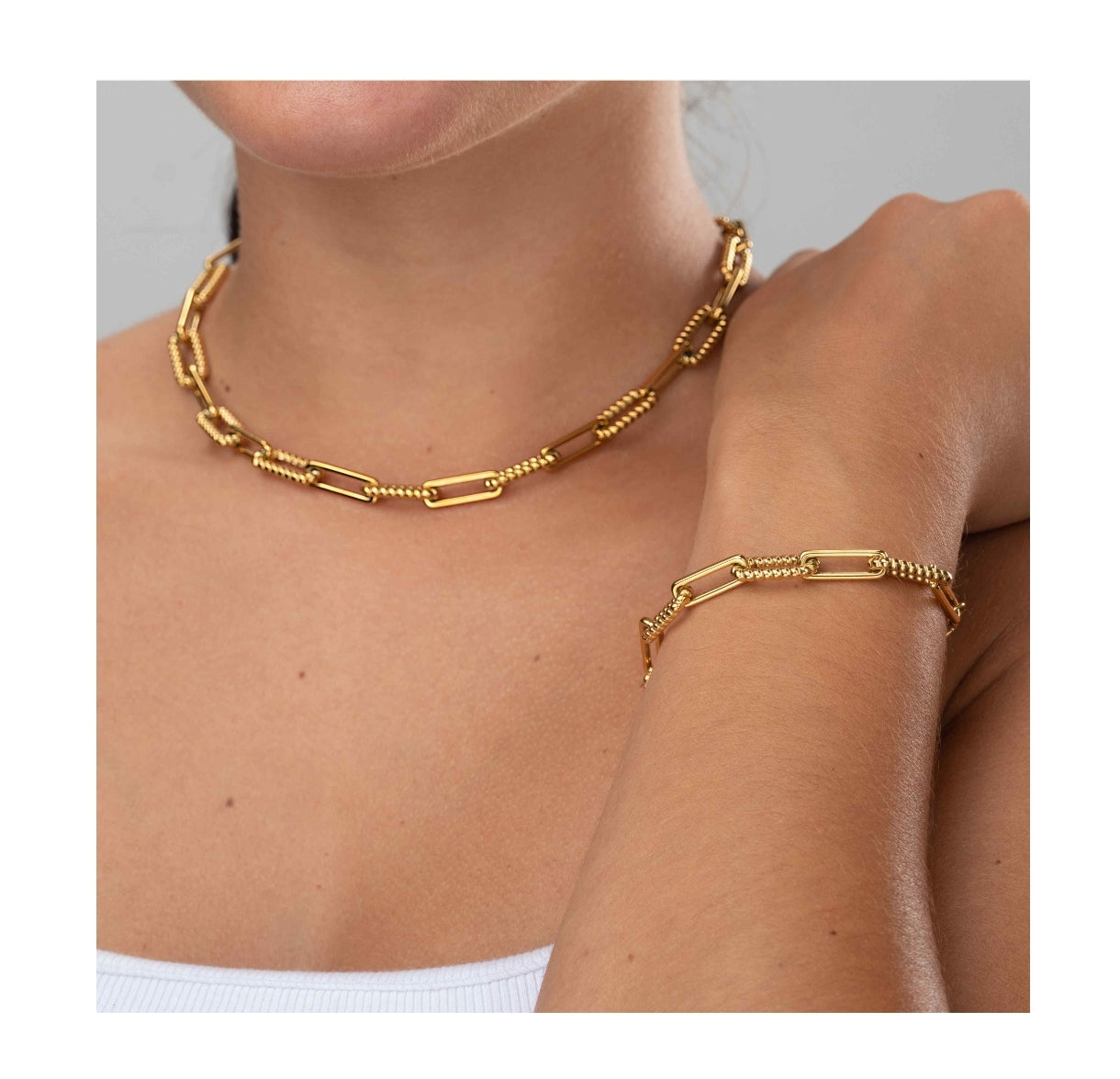 Chic meets bold in this dual-chain link bracelet — a perfect balance of sleek bars and textured loops. Stack it or wear it solo for instant polish. Complete the look with the matching necklace for double the shine!