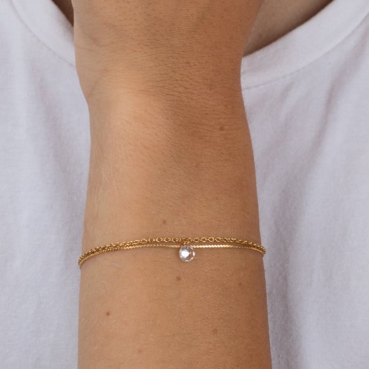 Elevate your style with this stunning double-stranded bracelet, crafted from premium stainless steel and plated in luxurious 18k gold. Featuring a sparkling zirconia for added glamour, it's waterproof, tarnish-resistant, and perfect for any occasion—from everyday elegance to special events. A must-have addition to your jewelry collection.