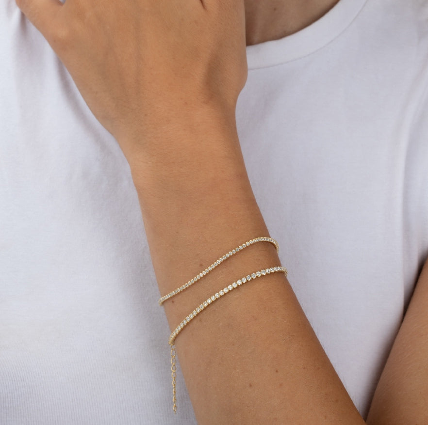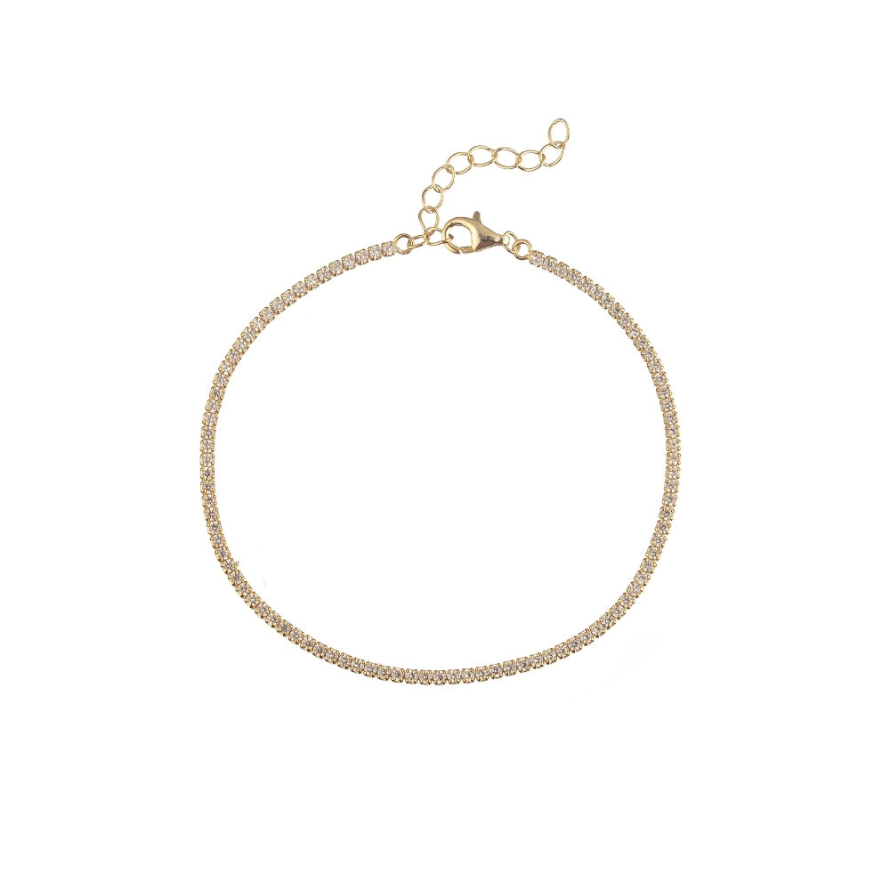 Enhance your elegance with this dainty 2mm white zirconia tennis bracelet. Set in a slim gold-plated band, it offers a subtle sparkle that adds a touch of refined glamour to any outfit. Get the matching necklace.