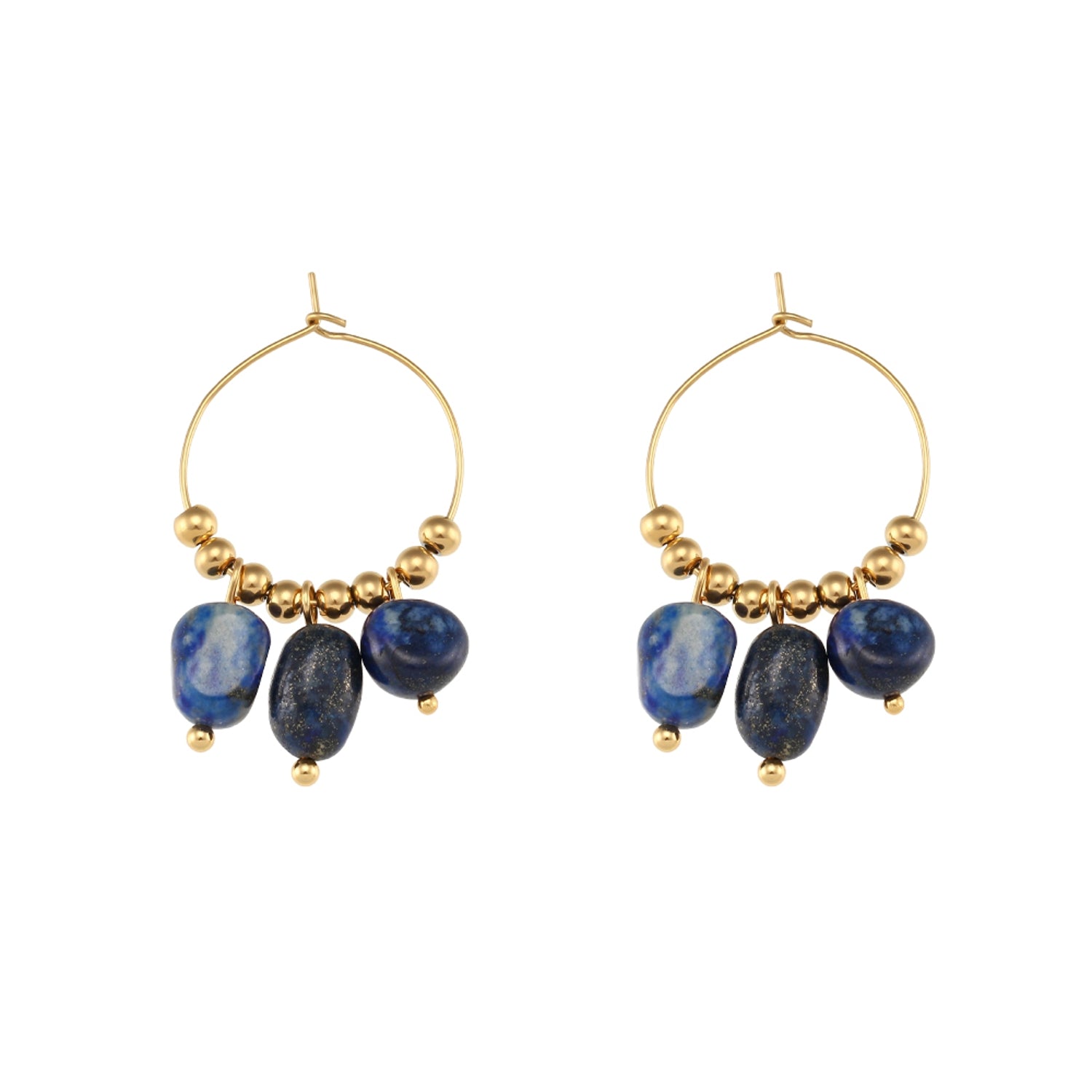 Experience luxury with these stunning stainless steel, gold plated hoop earrings featuring three mesmerizing lapis lazuli teardrop stones. Known for its rich, deep blue color and golden flecks, lapis lazuli is a semi-precious gemstone prized for its beauty and healing properties. These earrings are not only waterproof and durable, but also offer the added benefit of the stone's energy, making them the perfect accessory for any occasion. Elevate your style game and add a touch of sophistication to your look with these must-have, high-quality earrings.