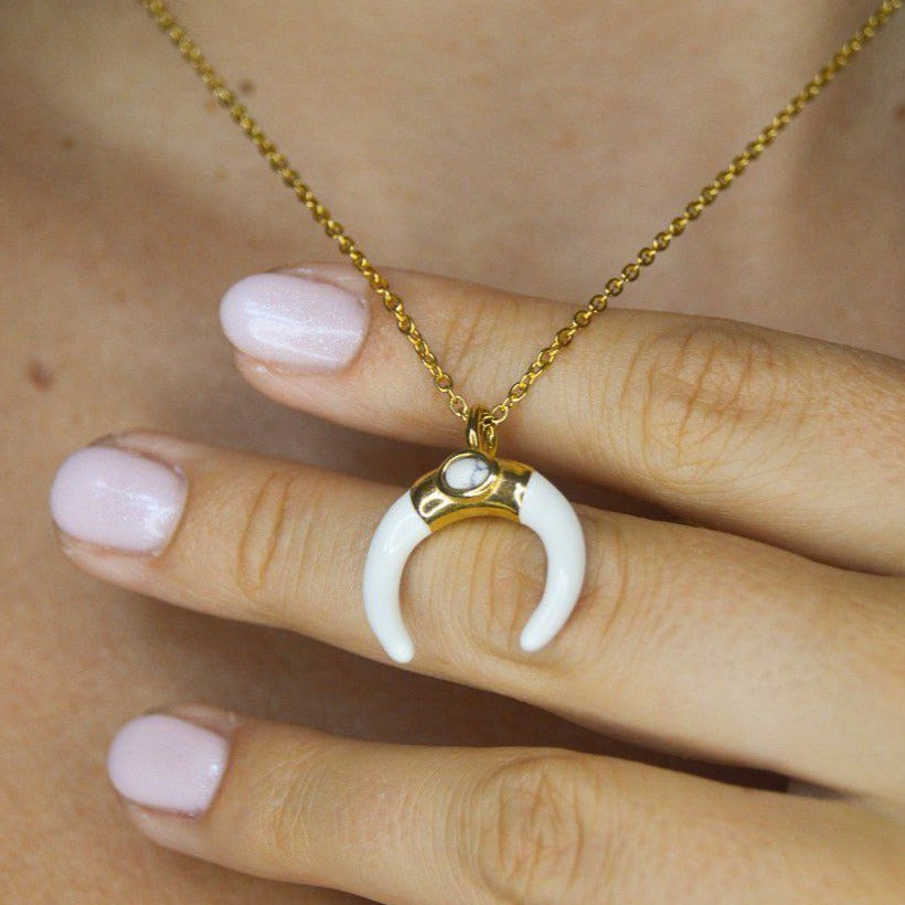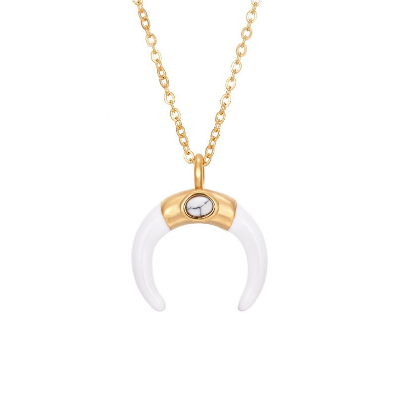 Unleash your inner celestial beauty with our stunning white agate half moon pendant necklace. The shimmering stainless steel gold plated chain adds a touch of glamour, while the striking white agate half moon captures the essence of mystery and enchantment. Whether you're seeking to create an air of sophistication or simply looking to add a touch of charm to your outfit, this necklace is the perfect accessory to make a statement. With its captivating blend of luxury and allure, you'll radiate the confidence of a goddess wherever you go. Order now and experience the beauty and power of the night sky in a single necklace.