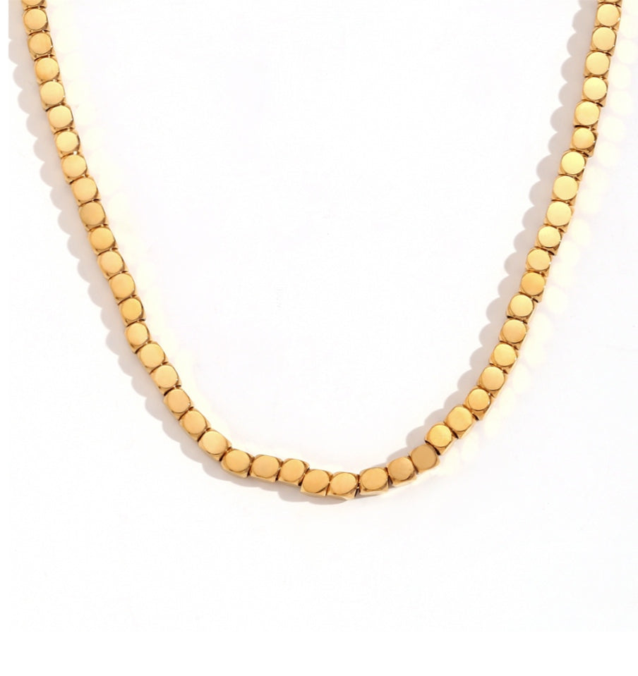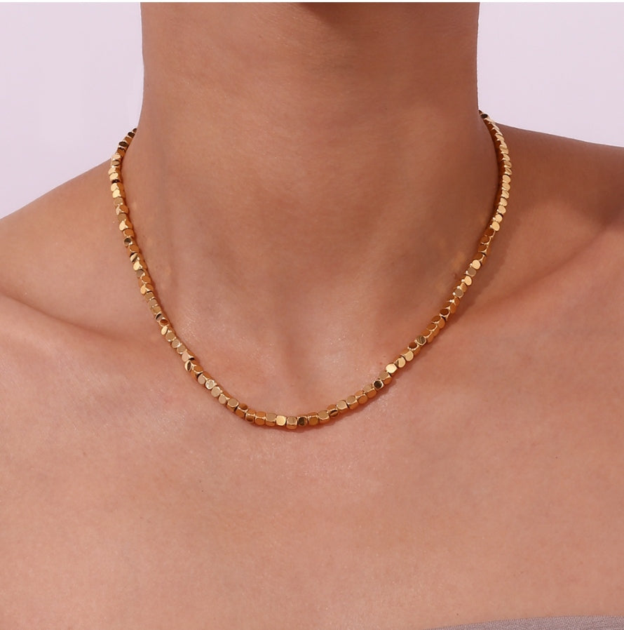 Bold and modern, this necklace features sleek, shiny gold cubes that catch the light beautifully—perfect for making a statement with effortless elegance!