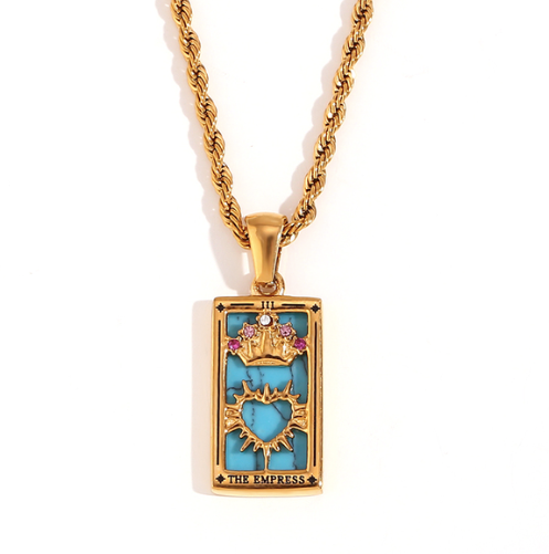 Elevate your presence with "The Empress" ensemble. Our exquisite rectangle pendant, set against a captivating blue background and adorned with a sparkling zirconia-studded crown, exudes regal charm.