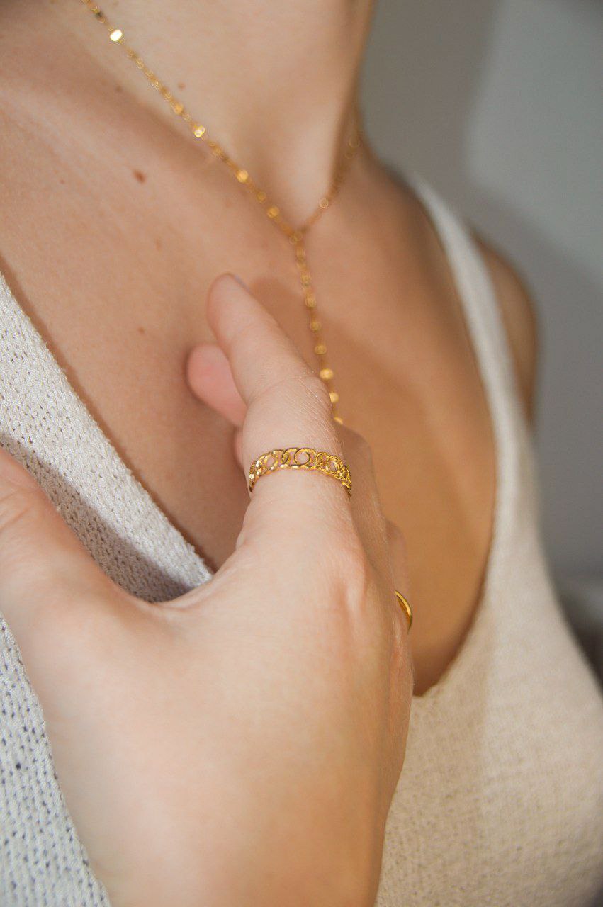 Elevate your jewelry collection with our sleek and modern stainless steel 18k gold plated, waterproof chain link adjustable ring. The adjustable feature of this ring make it a perfect fit for anyone and the gold plating with chain links give it a unique and trendy look. Durable and versatile, perfect for everyday wear, make it yours and stand out from the crowd.