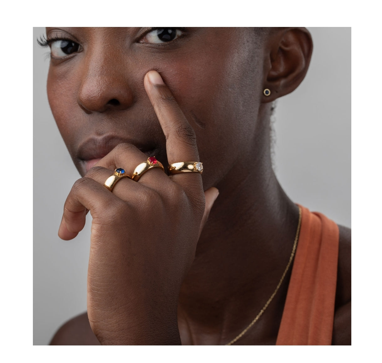 Make a bold yet timeless statement with this polished gold band ring, crowned with a brilliant zirconia stone in a classic prong setting. Available in red, blue, or white zirconia.